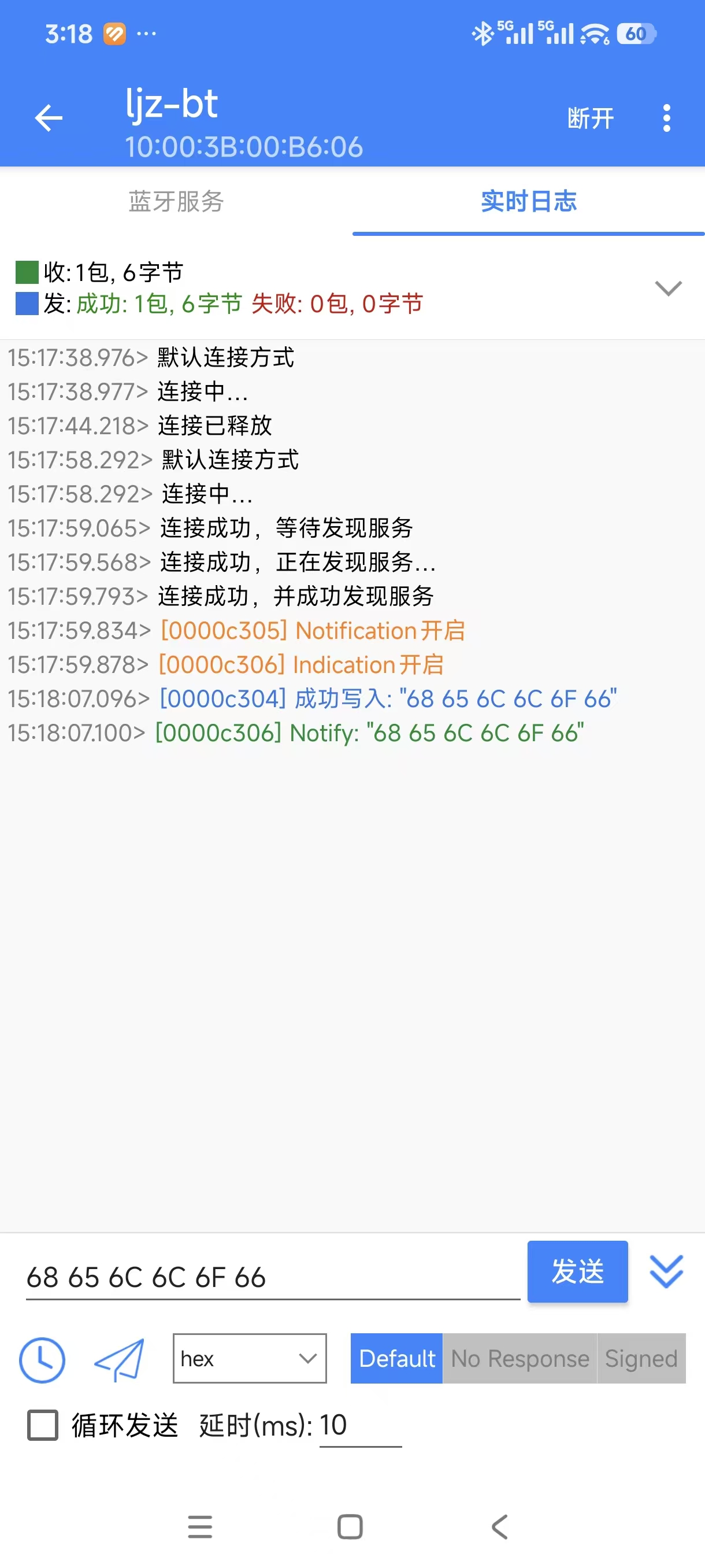 接收蓝牙助手发送的数据,设备将接收到的数据进行返回。