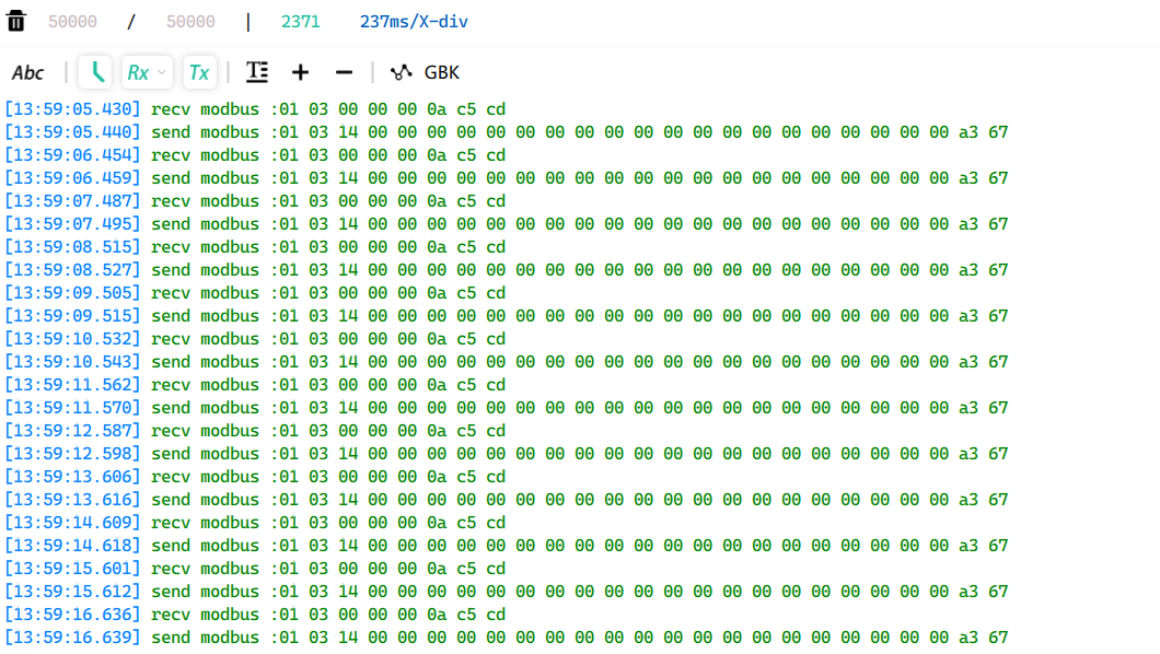 接收命令 (Rx): 01 03 00 00 00 0A C5 CD