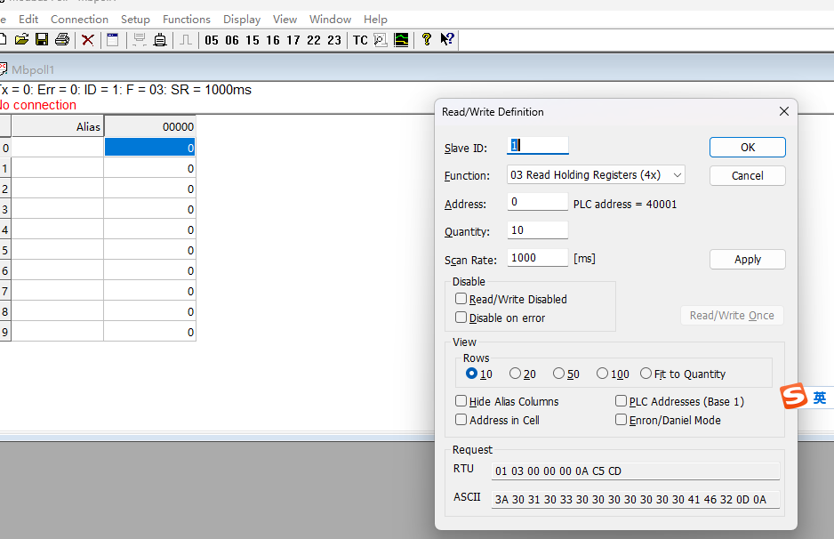 发送的请求是读取地址 40001 开始的 10 个保持寄存器。服务器返回了这 10 个寄存器的值,全部为 0。